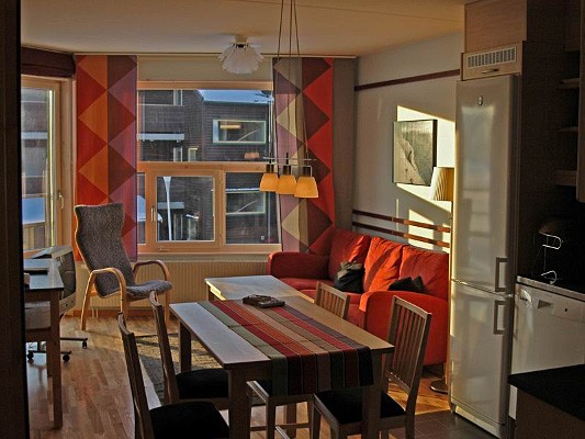 - Гостиная с кухонным уголком (холодильник с морозильной камерой, посудомоечная машина, плита, микроволновая печь, тостер, набор посуды)