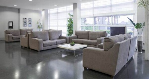 Стильный холл отеля, приглушенный свет, флюоресцентная подсветка зоны ресепшн и мраморные полы; через большие окна можно полюбоваться видом на город.