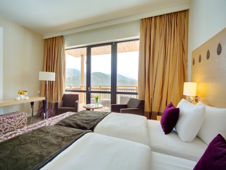 Family Rooms have all the extra room a family needs. Furnished with a king-size bed and an extra bed with a pillow-top mattress, guests can relax comfortably after skiing or hiking in Bukovel while enjoying a movie on the flat-panel LCD cable television.