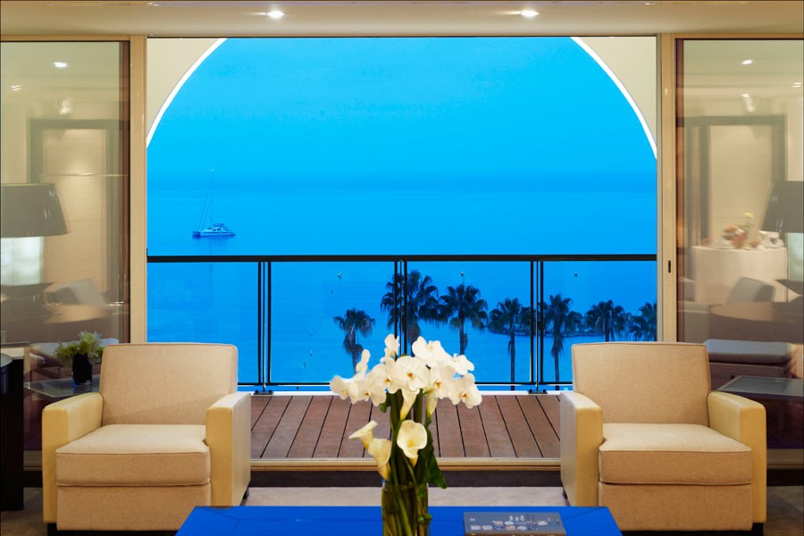 Prestige suite sea view with terrace (80 кв. м): терраса, гостиная, спальня, ванная комната. Панорамный вид на море и Дворец фестивалей.