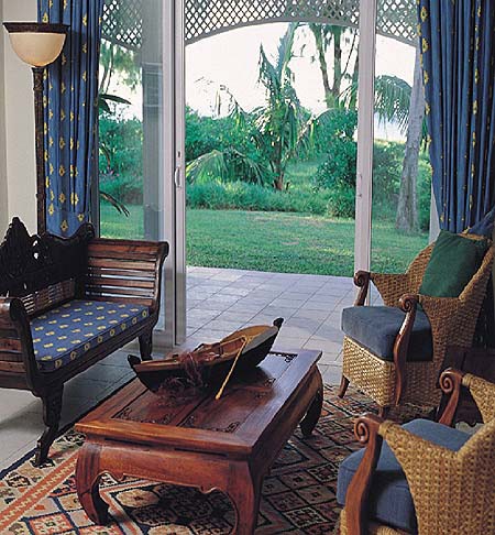 (175 кв.м): просторная спальня, отдельная гостиная, ванная комната с джакузи и душевой кабиной, душ на открытом воздухе, внутренний дворик, собственный сад, патио. А также в номере кондиционер, спутниковое телевидение, видеомагнитофон, телефон, голосовая почта, CD-плеер, магнитофон, машина для льда, холодильник, оборудование для приготовления чая и кофе, сейф, фен, порт для подключения к интернету
