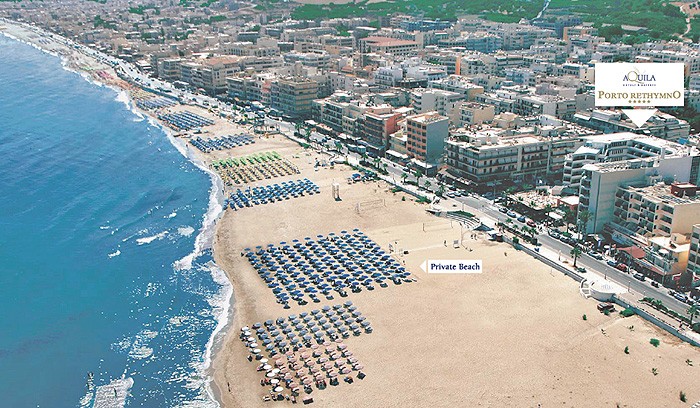 Отель Aquila Porto Rethymno находится в центра города Ретимно на острове Крит, в 600 метрах от порта города Ретимно и в 84 км от аэропорта города Ираклио. Пляж расположен через дорогу. Отель Aquila Porto Rethymno состоит из 6-ти этажного здания, открыт в 1992 году. Последняя реновация проведена в 2007 году. В отеле Aquila Porto Rethymno 199 номеров, 2 из которых — люксы. К услугам гостей отеля Aquila Porto Rethymno — служба регистрации и размещения, интернет-кафе, главный ресторан, ресторан a la Carte, холл с баром и открытой террасой, кафе, описание услуг отеля на русском языке, телезал, парикмахерская, магазины, конференц-зал, лифт, два открытых бассейна, крытый подогреваемый бассейн с пресной водой, сауна, массажный кабинет, парная, джакузи, тренажерный зал, настольный теннис, дартс, пляжный волейбол, пять теннисных кортов на базе отеля Rithimna Beach, дайвинг (в отеле Rithimna Beach), аренда велосипедов, водные виды спорта, виндсерфинг, водные лыжи, параглайдинг (полеты с парашютом), парусный спорт, водный велосипед, водный мотоцикл, разнообразные развлекательные программы для детей и взрослых, утренняя гимнастика, уроки греческого языка, лифты, обслуживание в номерах.