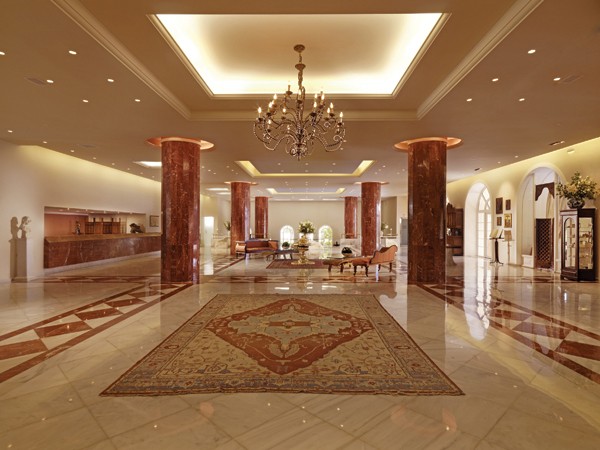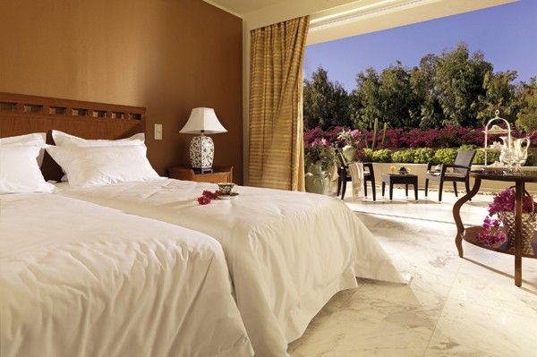 - Royal Suite (~170 кв.м) Вид на море, максимальное размещение 6 взрослых, состоит из 3 спален, 2 гостиных, обеденной зоны, гардеробной, 3 ванных комнат (одна с отдельной душевой и джакузи), туалета и просторной открытой веранды с зоной отдыха, обставлены антикварной мебелью и декорированные картинами известных греческих художников.
