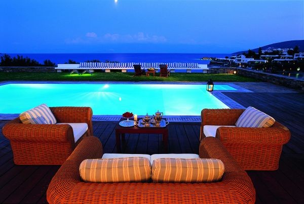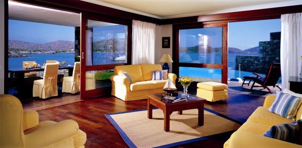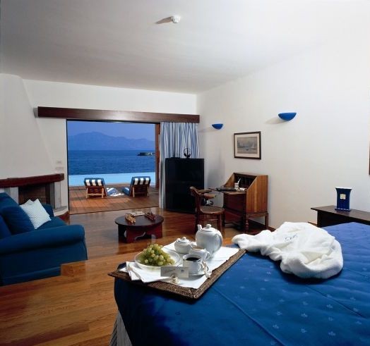 - Grand Suite with Private Heated Pool on Water´s Edge (135 м2) — Расположен на первой линии от моря и имеет панорамный вид на залив Мирабелло. Сюит состоит из двух вилл с общим садом и общим подогреваемым бассейном с гидромассажем. В одной из вилл – спальня, отдельная гостиная и ванная комната с ванной-джакузи, а в другой – большая комната, совмещающая в себе спальню и гостиную, гардеробная и ванная комната с парной и отдельной душевой кабиной. Дополнительно CD-проигрыватель, факс, цифровой широкоэкранный телевизор с DVD и наушниками, небольшой телевизор в ванной комнате, компьютер с принтером и прямым доступом к сети Интернет.