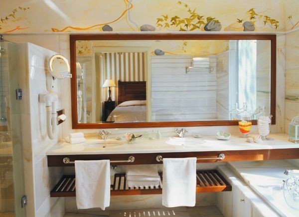 - в ванной комнате, отделанной мрамором, — ванна с гидромассажем, отдельная душевая кабина, фен, халаты, тапочки.