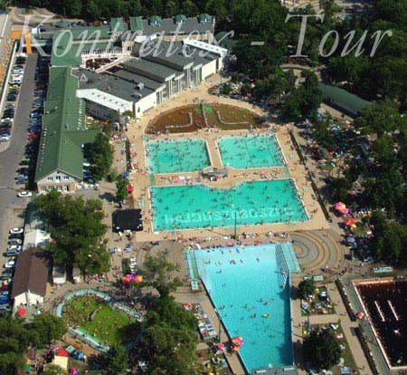 В центре города более 75 лет назад построен самый большой водолечебный комплекс в Венгрии, занимающий территорию 25 га. Несомненной достопримечательностью курорта является так же огромный аквапарк, который не могут оставить без внимания ни дети, ни взрослые. Аквапарк был открыт в 2000 году и был первым в Венгрии. Всего здесь 9 горок, самая большая из которых состоит из 4 уровней и её длина 1 км. Есть специальные мелкие бассейны для малышей, в которых стоят статуи больших слонов.
