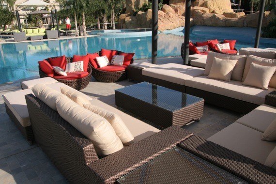 — зонтики, шезлонги, матрасы, полотенца у бассейна