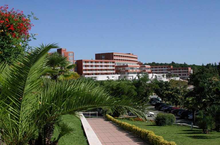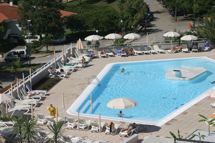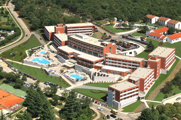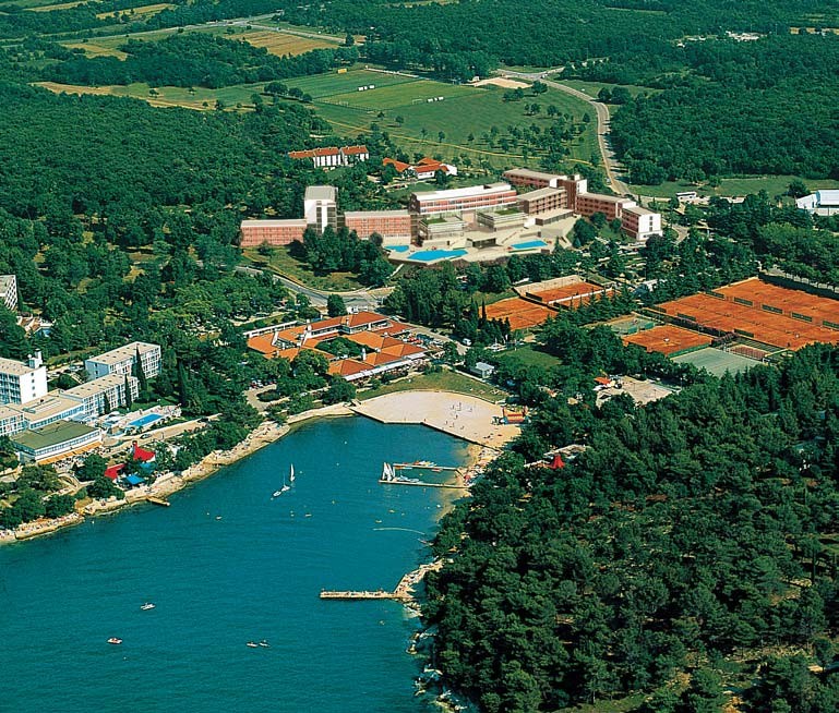 в центре туристического комплекса «ZELENA LAGUNA», в окружении высоких сосен и живописнейшей средиземноморской природы. До Пореча — 3 км, 60 км до аэропорта Пулы