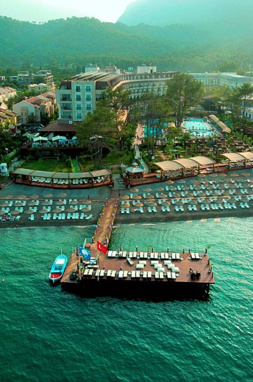 Расположен в 55 км от аэропорта г. Анталья, в г. Кемер, на самом берегу моря.