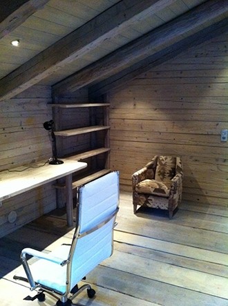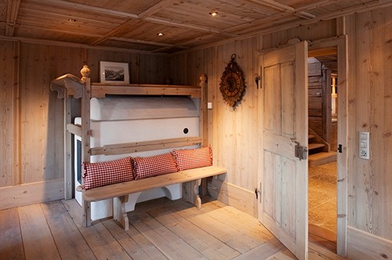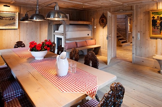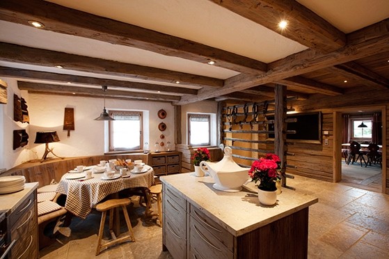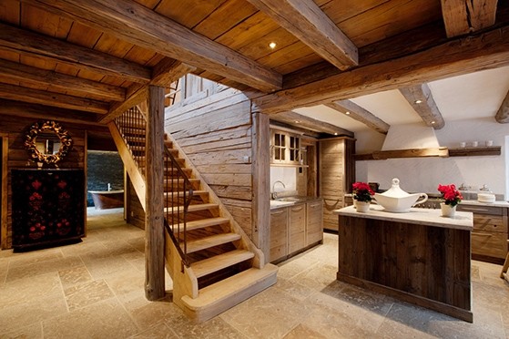 Возле входа в шале есть просторная открытая кухня, которая полностью оборудована современной техникой и газовой плитой. В углу комнаты находятся изогнутые скамейки, на которых могут разместиться от восьми до десяти человек с двумя дополнительными стульями возле большого обеденного стола. Кроме того, красивый деревянный пол, драгоценные и стильные картины придают особый шарм. На этом же уровне находятся просторная спальня с двуспальной кроватью, душем и спа-салоном, который оснащен сауной, контрастным душем и туалетом для гостей и имеет прямой выход на улицу.