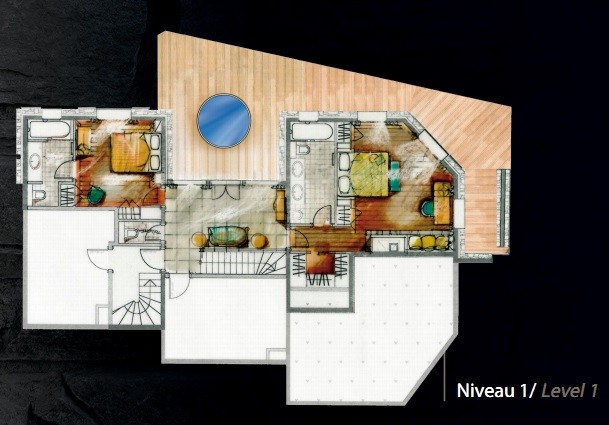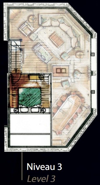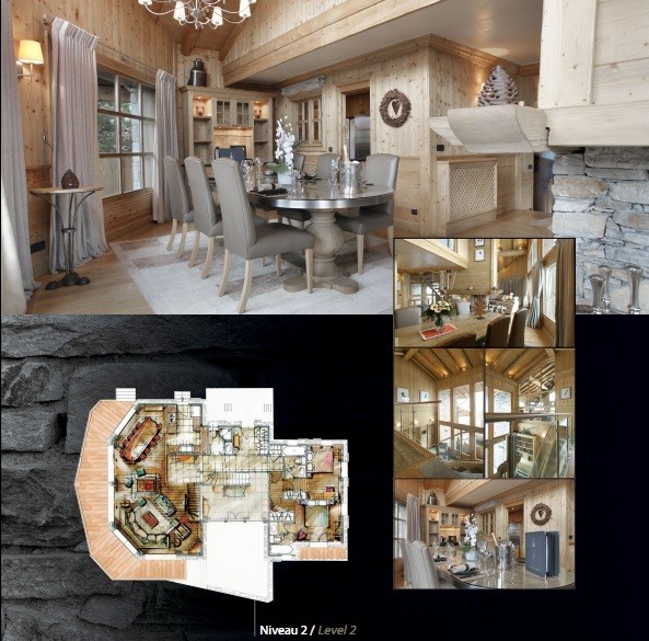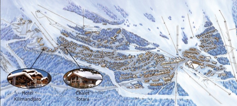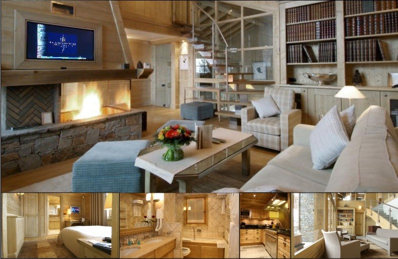 5 ванных. К услугам гостей: большая гостиная (60 м ?) с центральным камином, телевизором с большим жидкокристаллическим экраном, приставкой DVD, игровой приставкой PlayStation 3 и домашнем кинотеатром. С южной стороны располагается красивая терраса. Дом оборудован: хорошо укомплектованной кухней, Джакузи, лифтом, крытой автостоянкой, доступом в интернет во всех помещениях, телефоном с прямым доступом к рецепшн отеля «Le Kilimandjaro». Для не более 10 посетителей шале, предоставляется обслуживание на базе полупансиона. Заказ блюд производится по оригинальному меню ресторана отеля «Le Kilimandjaro».