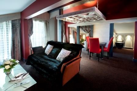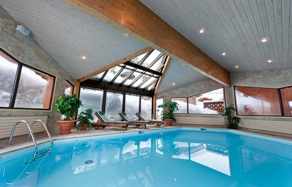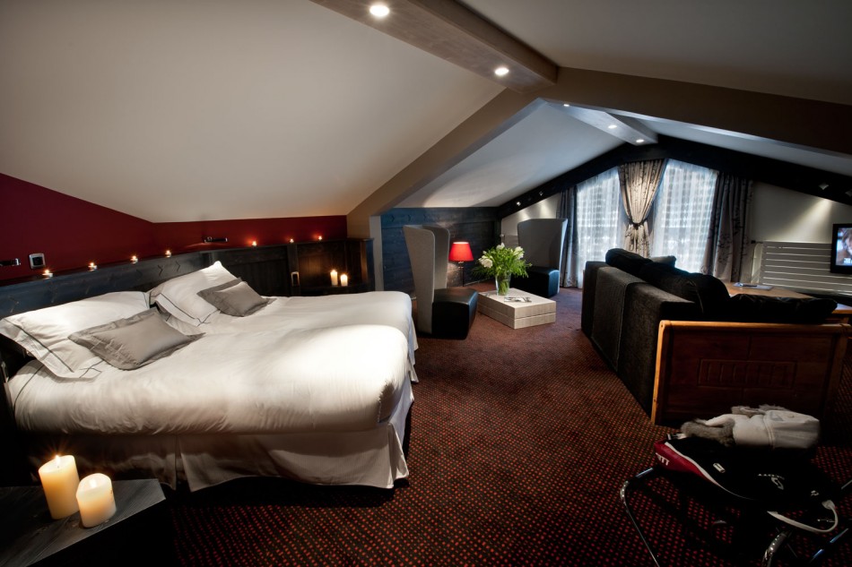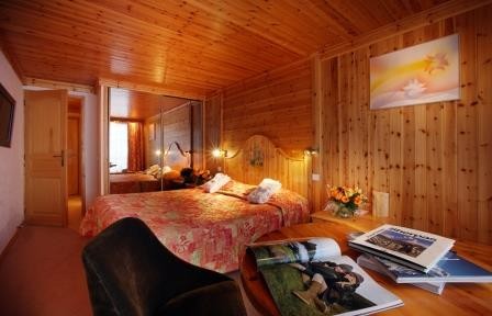 Интерьеры номеров оформлены в стиле традиционного альпийского шале с использованием отделки из натурального дерева.