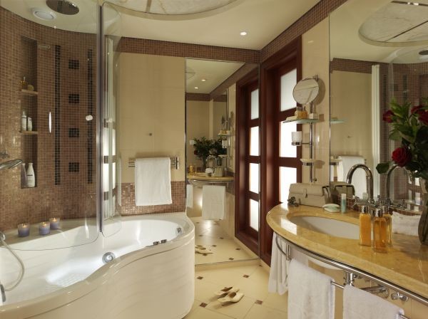 - Princess Suite Sea View: состоит из спальни с кроватью king-size, гостиной с обеденной зоной на 8 человек, 2 ванных комнат, отделанных мрамором, с джакузи и отдельным душем, гостевой туалетной комнаты, гардеробной, 3 меблированных балконов с видом на море. Дополнительно для гостей номера – отдельная стойка регистрации, ежедневно свежая пресса, корзина с фруктами и французское шампанское по прибытии, вечерний аперитив с канапе, также в номере – факс, весы, шелковые халаты, эксклюзивная туалетная косметика.