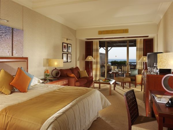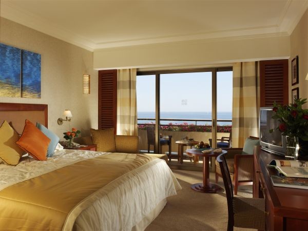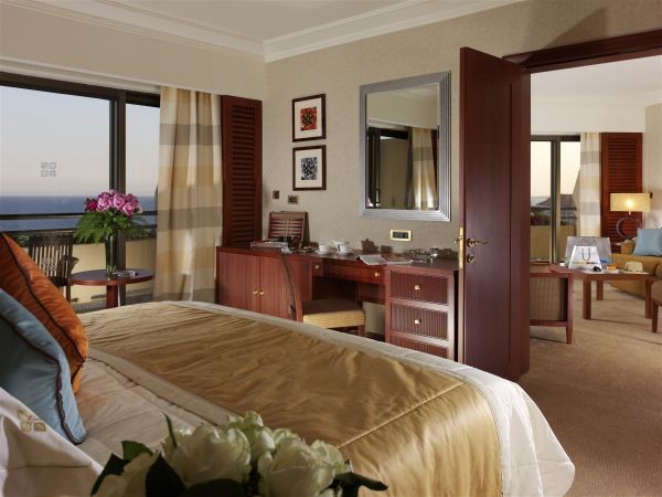 - Executive Suite Sea View: расположен на первом этаже, состоит из спальни с кроватью king-size, гостиной с обеденной зоной, ванной комнаты, отделанной мрамором, с джакузи и отдельным душем, большого меблированного балкона с видом на море. Дополнительно для гостей номера – отдельная стойка регистрации, ежедневно свежая пресса, корзина с фруктами и французское шампанское по прибытии, вечерний аперитив с канапе, также в номере – факс, весы, шелковые халаты, эксклюзивная туалетная косметика.