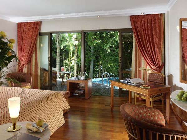 - Garden Suite: расположен на 1 и 2 этажах в саду, у «взрослого» бассейна, имеет веранду, выходящую на бассейн-реку, состоит из спальни с кроватью king-size, гостиной, ванной комнаты, отделанной мрамором, с джакузи и отдельным душем, меблированного балкона. Дополнительно для гостей номера – отдельная стойка регистрации, ежедневно свежая пресса, корзина с фруктами и французское шампанское по прибытии, вечерний аперитив с канапе, также в номере – дополнительная джакузи, факс, весы, шелковые халаты, эксклюзивная туалетная косметика.