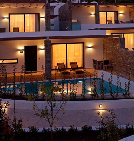 Роскошные и просторные бунгало и виллы отличаются по открывающемуся из них виду. Из вилл Panorama Villas открывается изумительный вид на чарующий Коринфский залив и побережье Пелопоннеса, тогда как виллы VIP рассыпаны посреди садов комплекса. Во всех номерах этой категории спальня объединена с гостиной, имеется мраморная ванна с джакузи и просторные балконы.