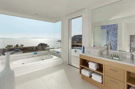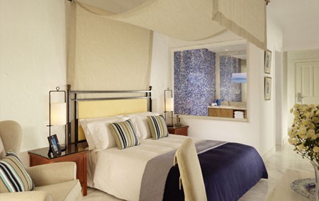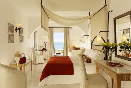 - Sea View Room: 33 м2, расположен в здании отеля; декорирован мрамором и изысканными драпировками; состоит из спальни c кроватью queen size с пологом, отделенной аркой от гостиной зоны, ванной комнаты, террасы или балкона с видом на море.