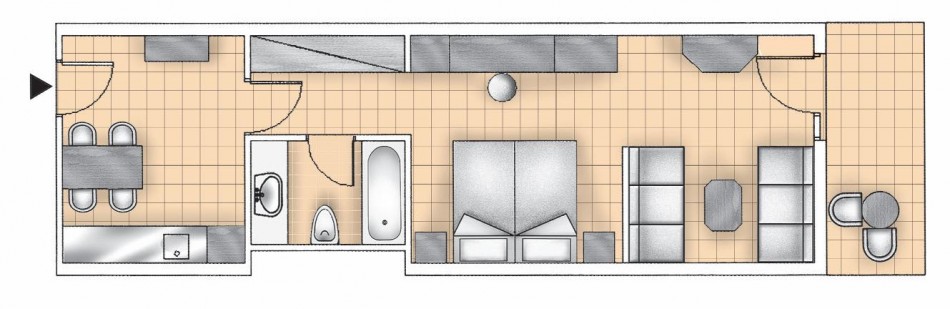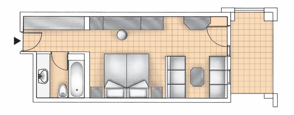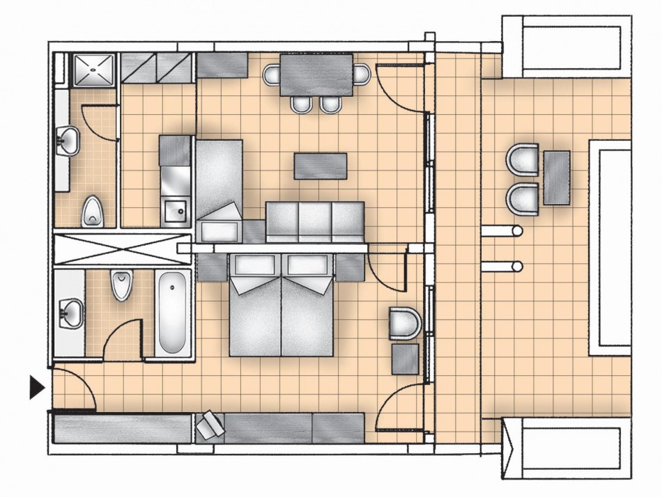 Одна спальня, одна гостиная / столовая, отделанная мрамором ванная комната с ванной, один WC / душ