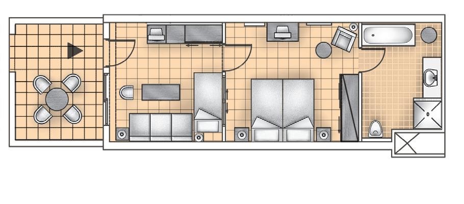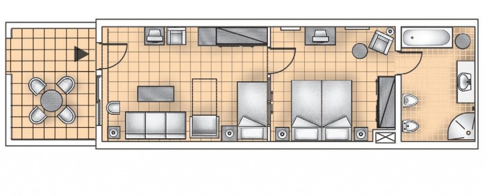 Одна спальня, одна гостиная / столовая, отделанная мрамором ванная комната с ванной, один WC / душ