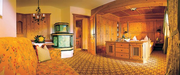- Junior Suite (35 — 40 м2) — состоит из спальни с просторной гостиной зоной, ванной комнаты, туалетной комнаты, балкона. В некоторых номерах есть тирольская печь.
