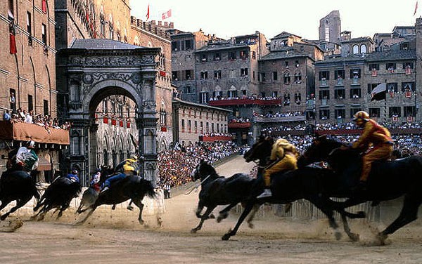 Два раза в год, 2 июля и 16 августа, на главной площади Кампо происходит Палио — соревнования наездников из разных контрад города. Так же называется флаг, который достается победителю. Лошадь — главный участник праздника. Несколько дней до скачек её круглосуточно охраняют 12 мужчин. Лошадь, финишировавшая первой, даже без всадника, считается победителем. Хотя этот праздник длится всего лишь 2 дня жители Сиены готовятся к нему загодя, шьют себе средневековые костюмы и прогуливаются в облике рыцарей или в праздничных одеяниях XV века по улицам города практически все лето.