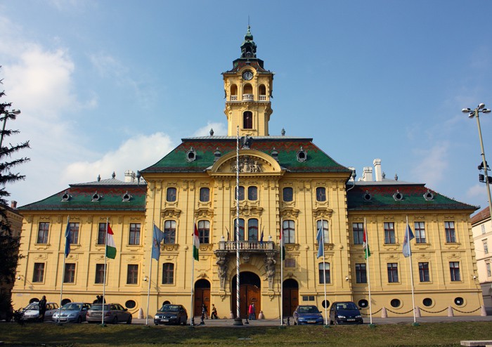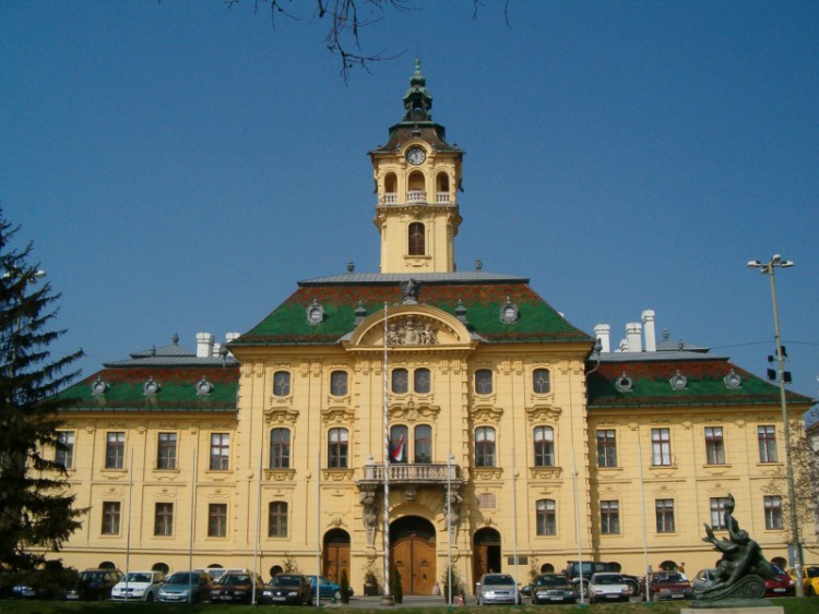 - Здание ратуши. Стоит на площади Сеченьи. Построено в 1883 году в стиле модерн. Перед входом — два фонтана, символизирующие созидательную и разрушительную мощь Тисы.